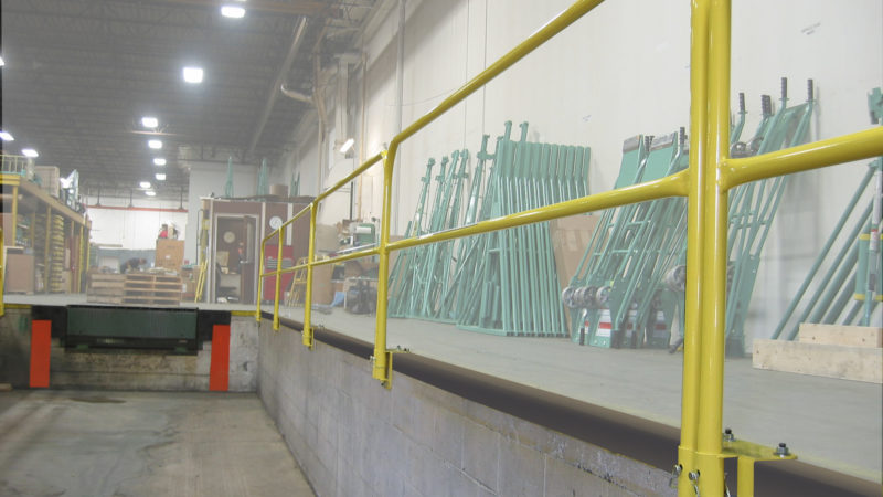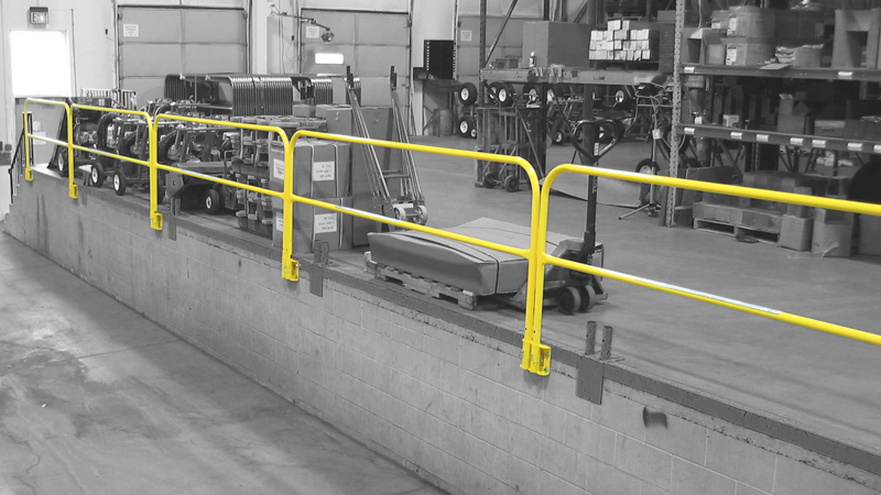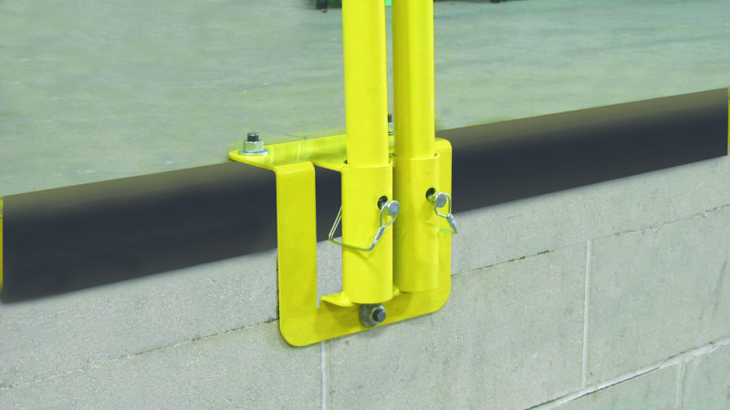 Vertical mounted Permanent Mount bases are anchored to vertical surfaces and use our long leg rail to establish an OSHA-compliant guardrail system. This can be deployed around shipping pits, mezzanine perimeters, or a myriad of other applications in material handling and warehousing applications.