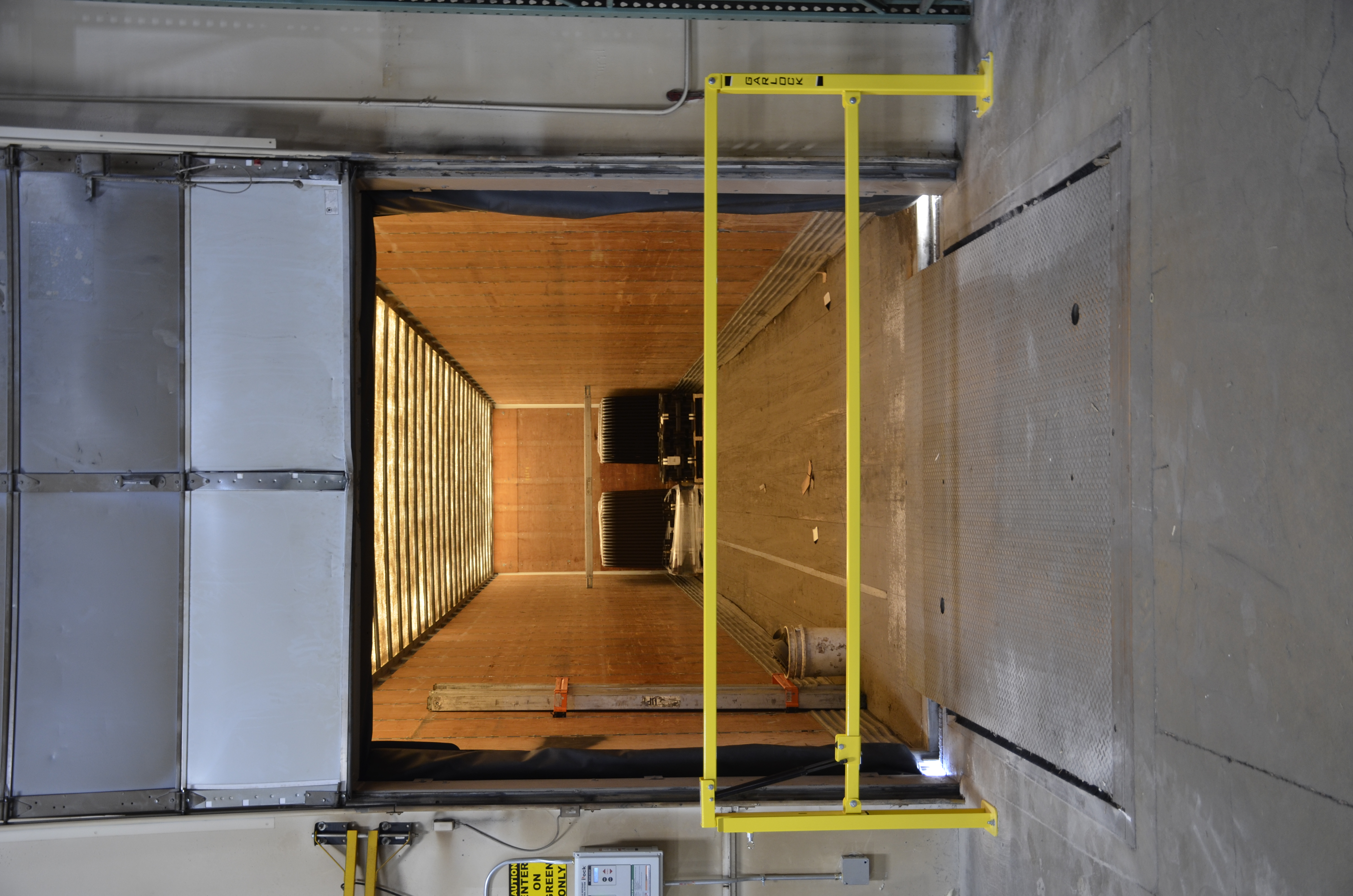 When open, the gas strut is up in the air away from passing goods and equipment preventing costly damage.