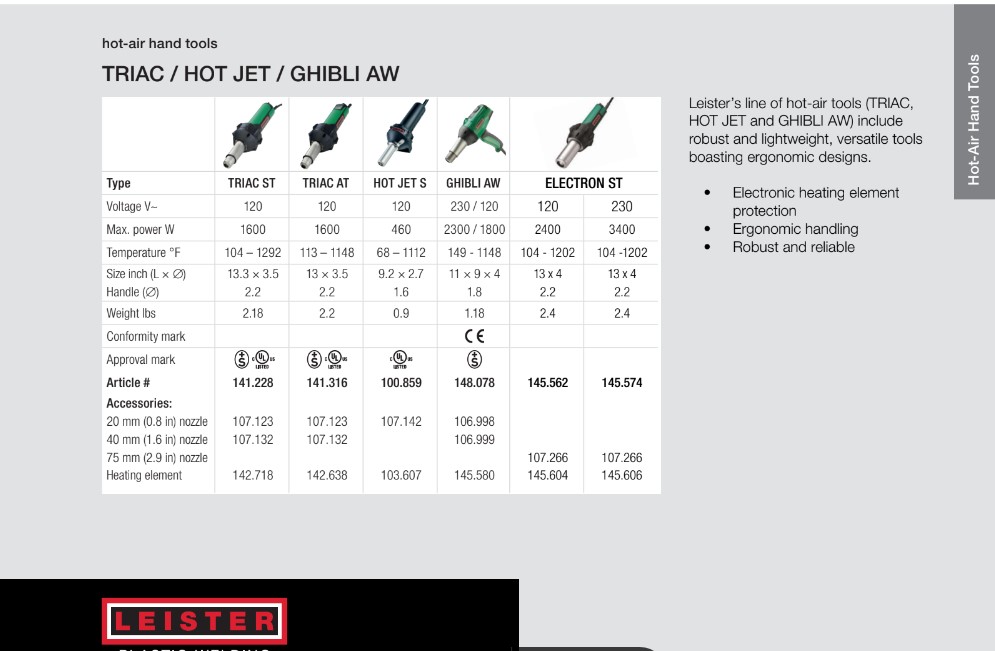VOLTAGE - 100 V; 120 V; 220 V; 230 V FREQUENCY - 50/60 Hz; 60 Hz POWER - 460 W TEMPERATURE - 20 - 600 °C TEMPERATURE SETTING STEPLESS - Yes AIRFLOW (20°C) - 20 - 80 l/min STEPLESS AIR VOLUME ADJUSTMENT - Yes STATIC PRESSURE - 1600 Pa ECO-MODE - No DISPLAY - No E-DRIVE - No OUTDOOR USE - Yes NOZZLE CONNECTION Ø - 21.3 mm / 0.85 in LENGTH - 235 mm DEVICE DIAMETER - 70 mm HANDLE DIAMETER - 40 mm WEIGHT - 0.36 kg POWER CABLE LENGTH - 3 m PLUG - US, 2 poles, 15A, polarized NOISE EMISSION LEVEL - 56 dB (A) APPROVALS - CE; KC; S+; UL PROTECTION CLASS - II APPROVAL NUMBER - MSIP-REM-Le1-Hot-JetS COUNTRY OF ORIGIN - CH