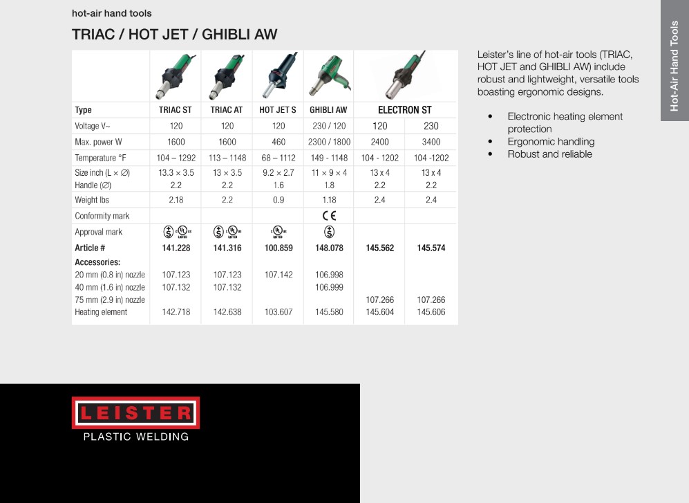 Leister's newest digital handwelder is likely the most intelligent yet robust tool designed for membrane applications. The Triac AT features ergonomic handling and a modern design making this tool suitable for any worksite where detail welding is necessary. The large e-Drive display allows for clear viewing and easy monitoring of welding temperatures and blower speeds. Independent control of both air flow and temperature ensures that quality weld that once again proves the renowned reliability of Leister tools.