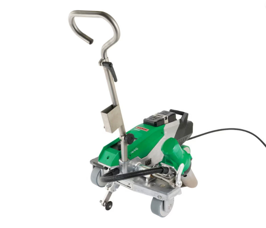 Process reliable flat roof welding The VARIMAT 500 automatic welding machine from Leister ensures reliable process safety when welding plastic sealing membranes and bitumen membranes on flat roofs. With high contact pressure, easy conversion from 230 to 400 V and innovative swing-in mechanism, it offers fast and precise nozzle positioning into the overlap. The flexible transport axis of the VARIMAT 500 ensures accurate tracking, even in roof closures close to the edge. Like its "big brother", the VARIMAT 700 automatic welder, the VARIMAT 500 is designed for many different applications: Whether for roofing work or swimming pool construction, the waterproofing membranes are processed reliably and quickly. Truck tarpaulins and advertising banners can also be welded perfectly with the VARIMAT 500. Its air partitioning concept, which is decoupled from the pressure roller, prevents wrinkles during welding. This ensures both optimal water flow and attractive appearance. The Monitored Welding Assistant gives users the assurance that the weld meets the high quality requirements of the customer. If the set welding parameters (temperature, speed and air volume) are exceeded, the VARIMAT 500 signals this with an acoustic and optical signal. In the event of undervoltage up to a maximum of 20 %, the automatic roof welding machine continues to reach the required welding temperature thanks to its power management. If the undervoltage is greater than 20 %, the VARIMAT 500 switches off automatically because the quality of the weld may then no longer be guaranteed. To ensure that the correct welding parameters are set, Leister offers reliable welding profiles and a "library" of proven welding recipes in the myLeister app. At the customer’s request, the VARIMAT 500 was equipped with an LED work light. Thus, welding of the roofing membranes is possible even at night or at dusk, because the welding zone is optimally illuminated. The large, user-friendly display and its rotating adjustment knob make the VARIMAT 500 intuitive to operate. Service requirements are low due to the brushless, maintenance-free hot air blower, even under intensive load. Hybrid ceramic bearings in the blower motors ensure a long service life. The VARIMAT 500 can be transported easily, ergonomically and safely in the sturdy rolling transport case (included in delivery). In order to cover individual customer requirements, the VARIMAT is available in two further versions: VARIMAT 700 and VARIMAT 300.