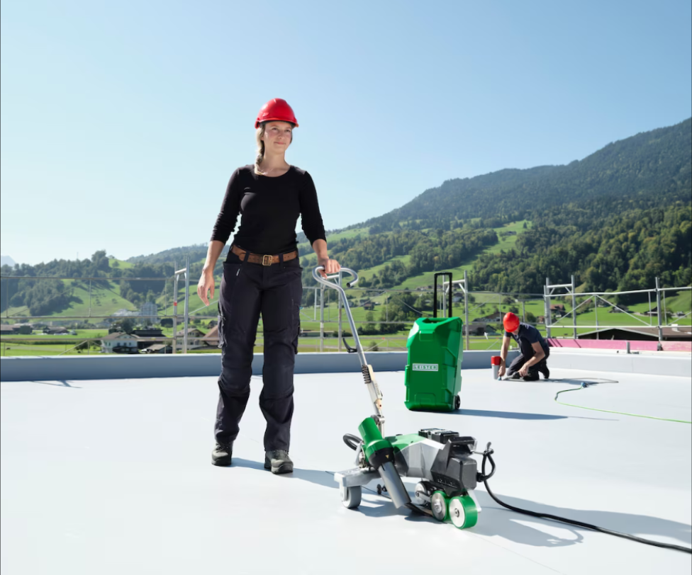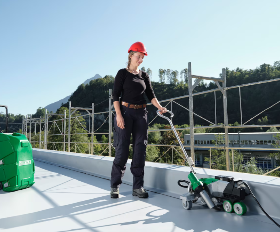 Flat roofs reliably welded 4.0 The Leister VARIMAT 700 automatic welding machine features high contact pressure, ensuring consistent process reliability when welding thermoplastic membranes on flat roofs. Highlights include easy conversion from 230 to 400 V and an innovative swivel-in mechanism to insert the nozzle effortlessly and quickly into the overlap. The flexible rear transport axle provides for balanced handling and allows the VARIMAT 700 to track straight without correction. Depending on the application, it can be adjusted to accommodate either field seam or close edge detail welding. The VARIMAT 700 automatic welding machine is designed for various applications: Whether for roof installation or swimming pool construction, waterproofing membranes are processed reliably, quickly, and economically. Truck tarpaulins and advertising banners can also be welded dependably with the VARIMAT 700. The increased contact pressure provides an advantage by compensating for unevenness in the substrate caused by fasteners, seams, or imperfections in the insulation. The sophisticated air partition concept, now separated from the pressure roller, prevents wrinkles during welding and ensures an attractive seam appearance while optimizing air flow. The Monitored Welding Assistant assures users that welds meet customer requirements and high-quality standards. If set welding parameter limits (temperature, speed, and air volume) are exceeded, the VARIMAT 700 emits an acoustic and visual warning signal. Like other Leister automatic welding machines, the VARIMAT 700 is also equipped with the proven Leister Quality System, also known as LQS-Roofing. This allows users to document weld quality and create GPS-supported data reports that can be saved and shared via the myLeister app. In the event of undervoltage conditions (up to a maximum of 20%), the power management system assists to achieve and maintain the required welding temperature. As soon as undervoltage surpasses 20%, the VARIMAT 700 switches off automatically, as the set welding parameters can no longer be maintained, and weld quality may no longer be guaranteed. To ensure that the correct welding parameters are set, Leister offers dependable welding profiles and a "library" of proven welding recipes in the myLeister app. Leister's Scandinavian customers desired an automatic welding machine to be equipped with an LED work light, so Leister engineers implemented this suggestion during the development of the VARIMAT 700. Thus, with this automatic roof welding machine it is possible to weld at dawn, dusk, or in unsuitable lighting conditions while optimally illuminating the welding zone. The large, user-friendly display with rotating adjustment knob makes the VARIMAT 700 intuitive to operate. When developing this Leister automatic welding machine, input was gathered from roofers and material manufacturers and taken into consideration, which is additionally reflected in its functional design and suitability for construction sites. The brushless, low-maintenance automatic welder keeps service to a minimum, even with intensive workloads. Hybrid ceramic bearings were used for the blower motors, ensuring a long service life even under heavy loads. Delivered in a robust rolling transport case, the VARIMAT 700 can be transported easily, ergonomically, and safely. To accommodate individual customer requirements, the VARIMAT is available in two additional versions: VARIMAT 500 and VARIMAT 300.